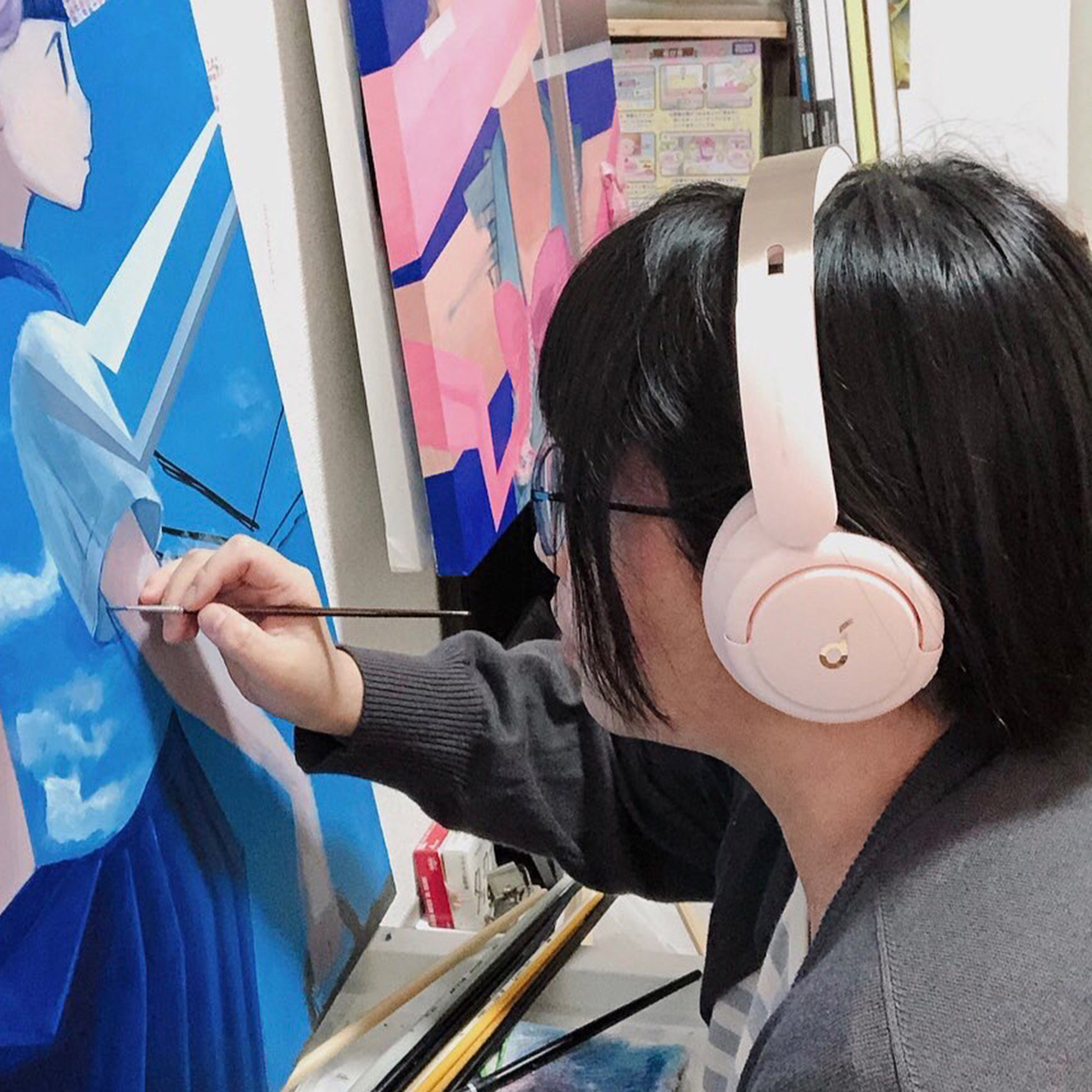 「つくられたもの」をテーマに、画像ファイルや3Dオブジェクトの「グリッチ」を取り入れたキャラクターを油絵の具やアクリル絵の具で描く。